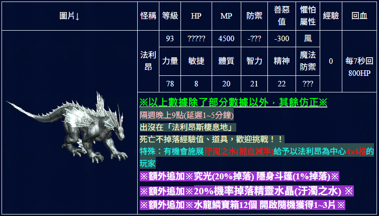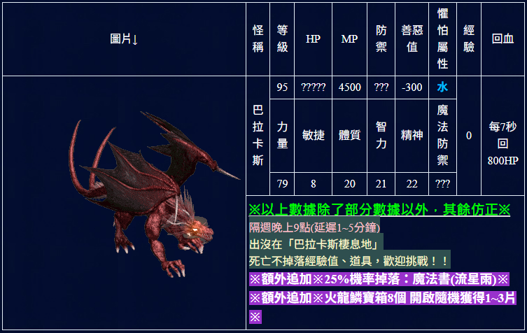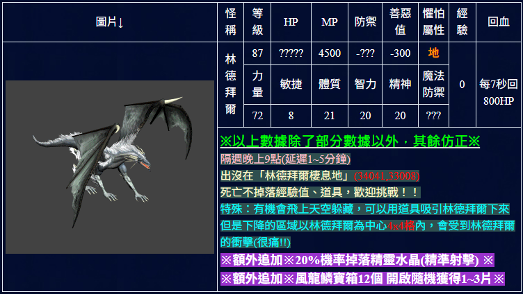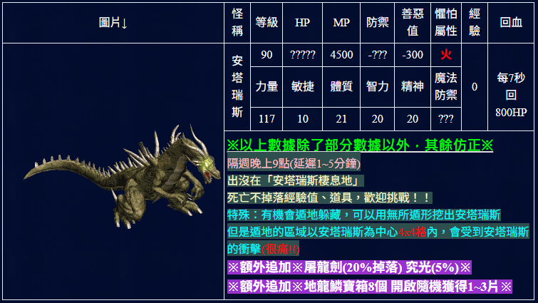 晚上:20:00 至 23:00地點:各個龍棲息地 死亡不掉落經驗 道具 ,龍的棲息地範圍無法PVP玩法:討伐四龍獲得夢幻道具!備註:攻擊不到四龍(揮空),是你的問題不是龍的問題!