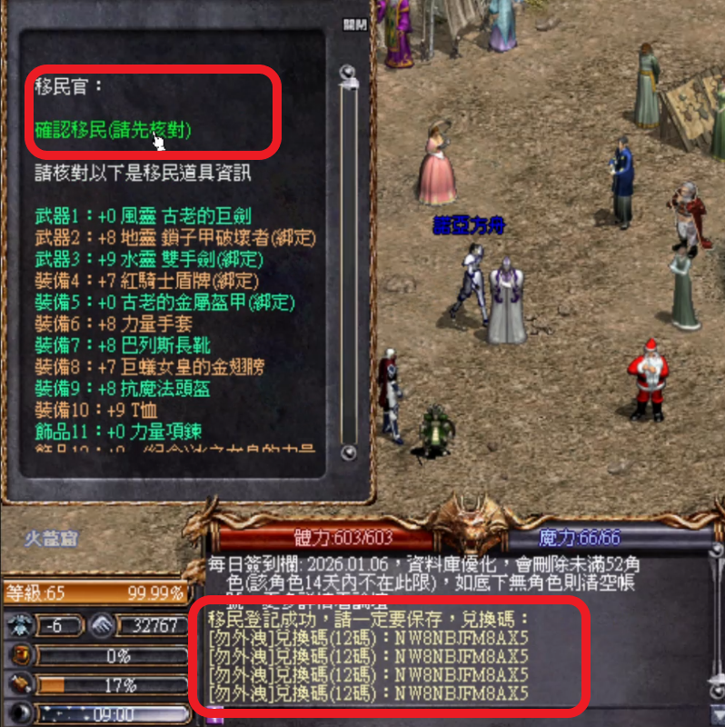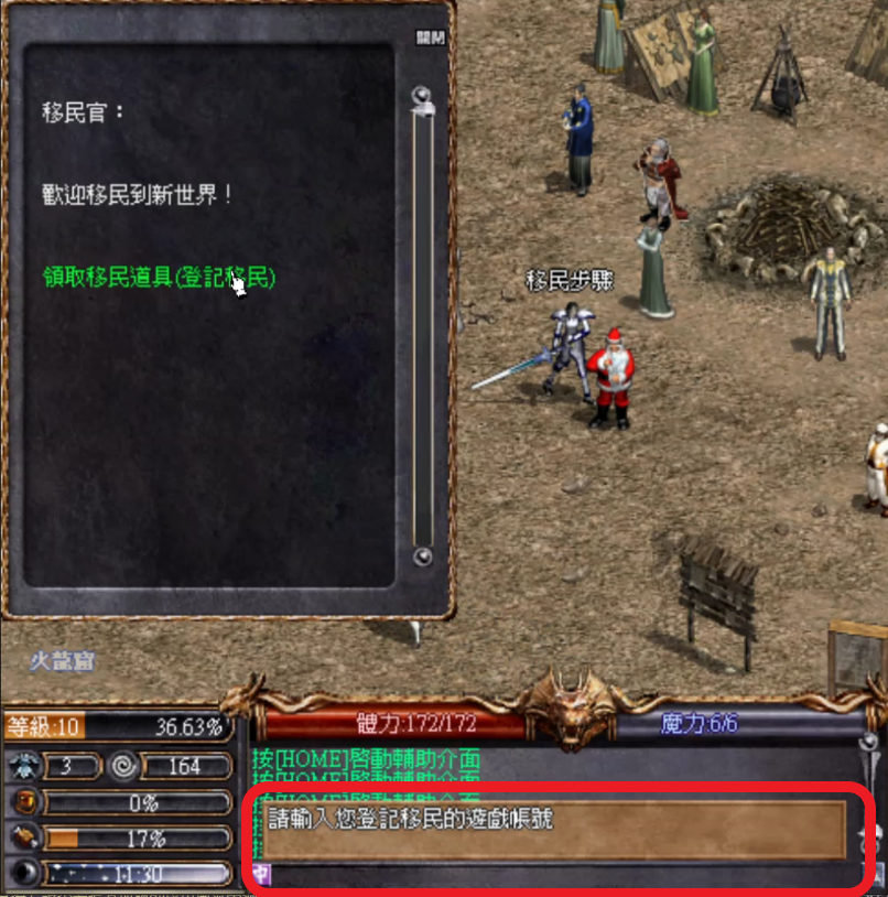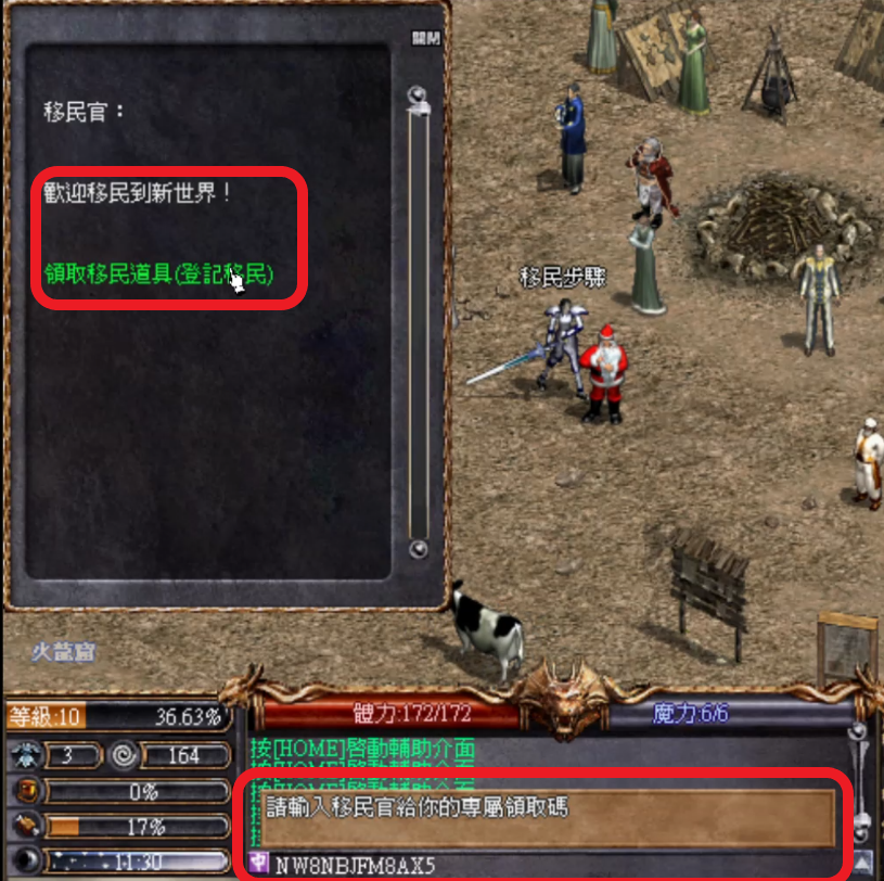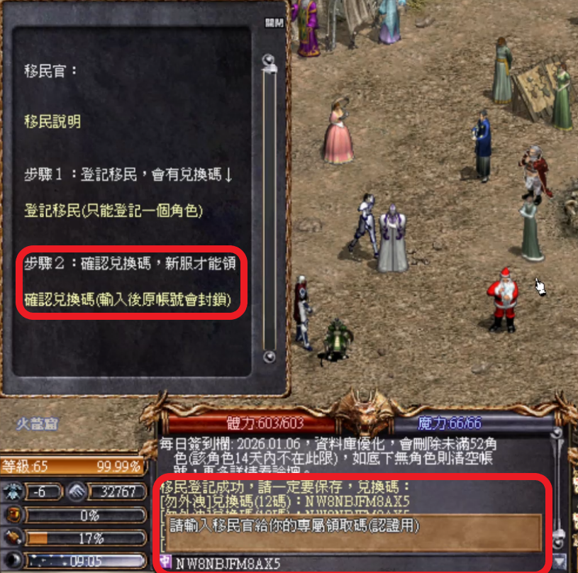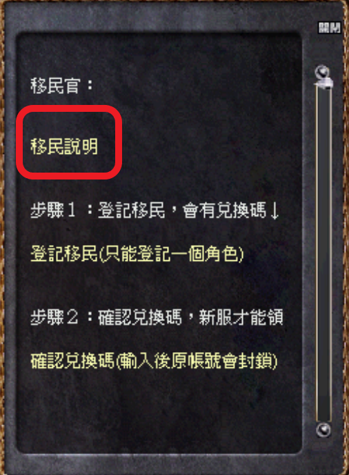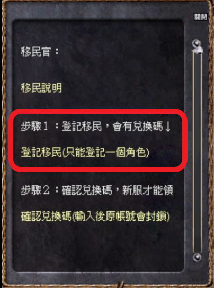 在新服創帳號&角色後 各大主城找移民官NPC輸入 "兌換碼" 及 原服"遊戲帳號" 核對完成後即移民成功(此時會有移民裝備等級還有洗血套組,法師有"高寵30日")